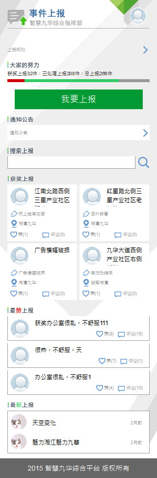 事件上報前臺主要功能有:提交上報、搜索上報、查看獲獎上報、查看最贊上報、查看最新上報等操作。提交上報操作前須關(guān)注“九華人”微信公眾號,并進行帳號注冊后才可進行操作。