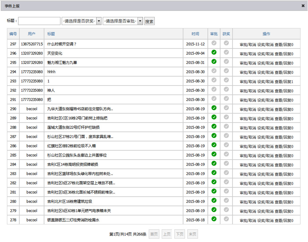 事件上報后臺主要功能有:收集所有上報數(shù)據(jù),并進行查看上報、回復(fù)上報、上報審核、上報設(shè)獎等操作。