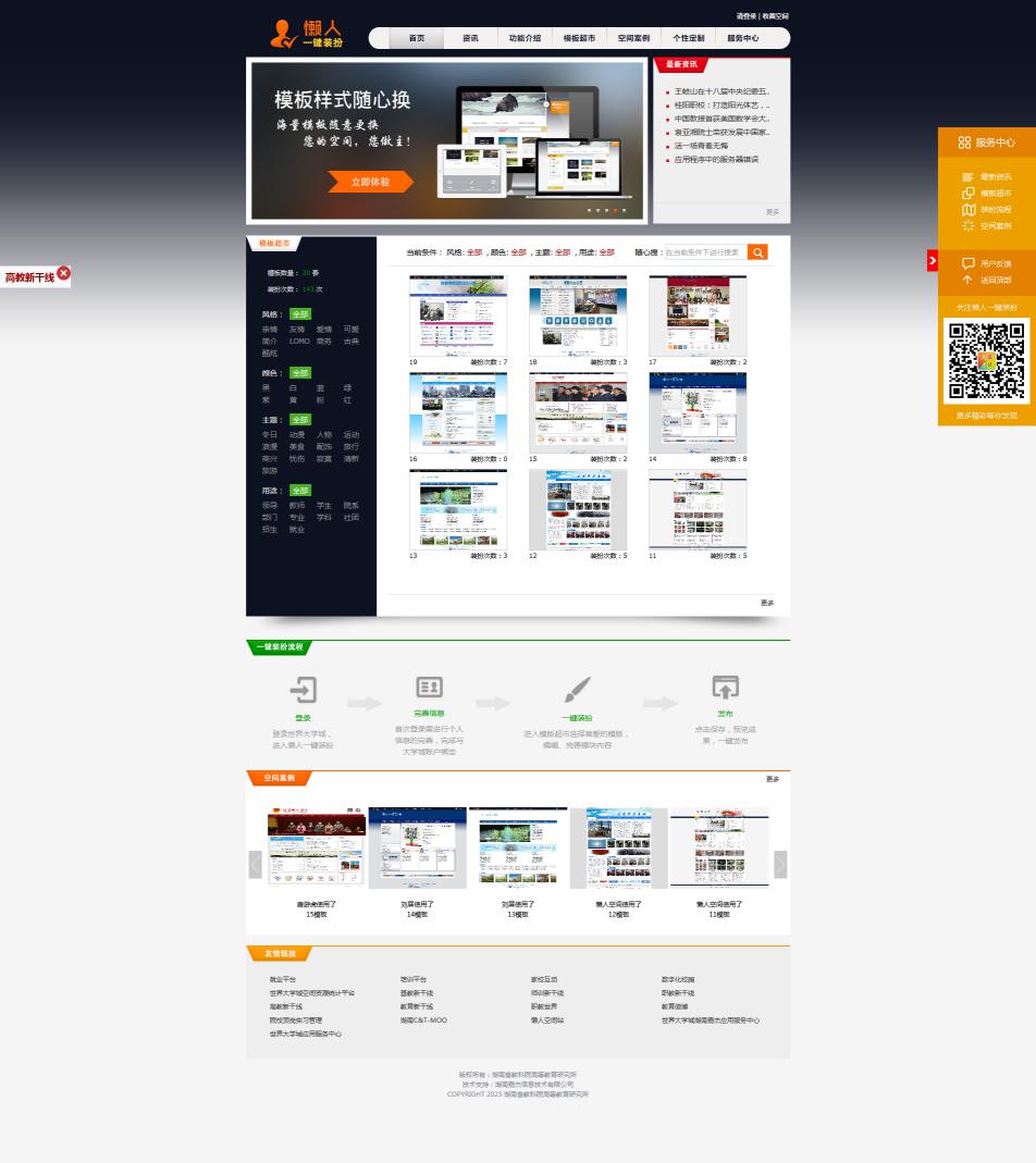 懶人一鍵裝扮系統(tǒng)是為世界大學(xué)城空間量身打造的一款一鍵式建設(shè)及美化工具。該工具為不僅為空間不同角色用戶,如:學(xué)生、老師、領(lǐng)導(dǎo)、職能處室提供了多樣性空間模板選擇,而且可以直接同步空間應(yīng)用功能,使欄目建設(shè)、文章發(fā)布、導(dǎo)航建設(shè)等功能都可以在該工具上一站完成。該工具為用戶提供了一個無需了解HTML、CSS、PS等代碼,無需學(xué)習(xí)計算機使用軟件,就可以快速打造一個美觀實用的的空間,解決了用戶自主建站耗時長、專業(yè)要求高、操作復(fù)雜等問題。