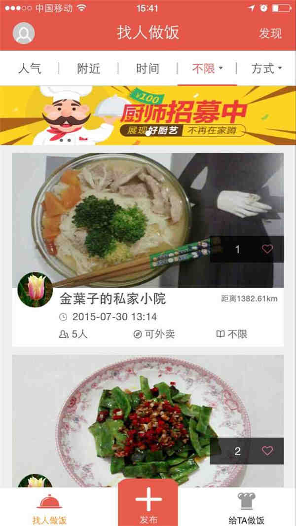 在家吃:由深圳在家文化傳播有限公司策劃的一種集家廚、社交、賺錢(qián)為一體的生活類(lèi)APP,旨在為人們提供一個(gè)更為方便舒心的“吃飯”平臺(tái),享受獨(dú)特的美味生活。是一款集家廚、社交、收益為一體的生活服務(wù)類(lèi)手機(jī)應(yīng)用軟件,主要面向兩個(gè)群體:擁有好廚藝卻賦閑在家的社區(qū)阿姨或大叔以及身處異鄉(xiāng)想吃家鄉(xiāng)菜又不想自己做飯的上班族。阿姨或大叔可通過(guò)手機(jī)客戶(hù)端發(fā)布自己的拿手菜以展示廚藝,賺取外快,吃貨可線上選擇做飯方式并預(yù)約廚師做飯。