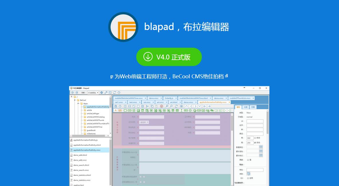 blapad - 布拉編輯器,是一款Web前端工程師使用的開(kāi)發(fā)集成環(huán)境(IDE),集站點(diǎn)管理、目錄文件組織、頁(yè)面設(shè)計(jì)器、代碼編輯、生成、預(yù)覽等功能于一身。
