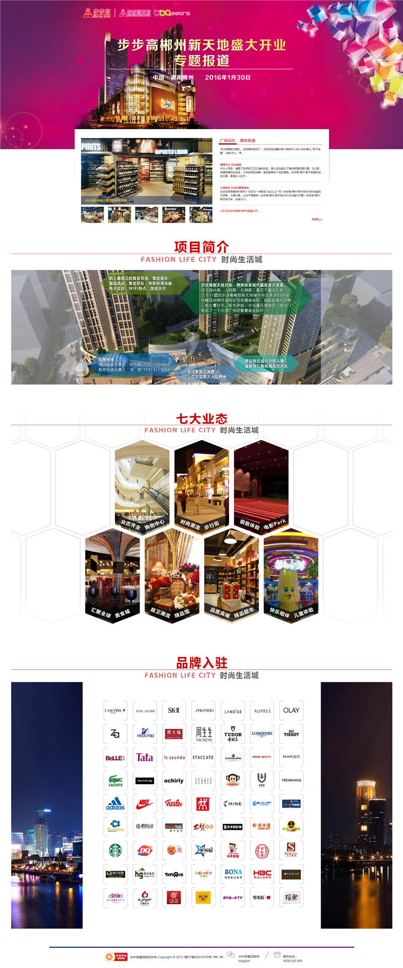 步步高集團(tuán)為慶祝步步高郴州新天地盛大開業(yè)特制作此專題,由貝一科技設(shè)計制,專題美工以喜慶、時尚為主題,用大幅的用圖來展示項目簡介、品牌入駐等內(nèi)容。獲得步步高文化宣傳部的一致好評。