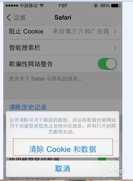 第三步進(jìn)入“Safari”頁(yè)面后,我們下拉該頁(yè)面找到清除歷史記錄和清除Cookie和數(shù)據(jù)。