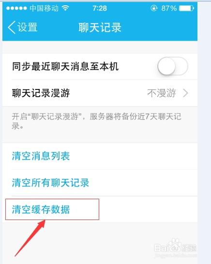 第四步進(jìn)入“聊天記錄”頁(yè)面后,我們找到“清空緩存數(shù)據(jù)”: