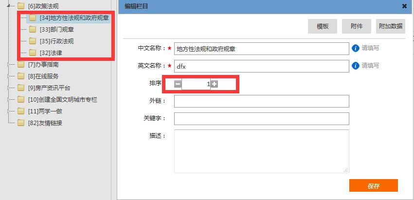 3、在欄目編輯窗中找到“排序”進(jìn)行排序,為防止規(guī)則與前臺不符,排序規(guī)則與前臺模板人員進(jìn)行溝通,兩邊一致即可。如下圖: