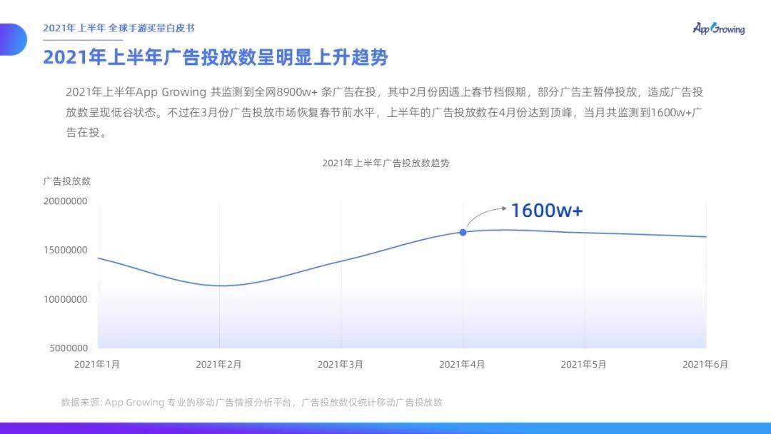 縱觀2021年上半年的手游買量市場(chǎng),可見上半年廣告投放數(shù)呈現(xiàn)明顯的上升趨勢(shì)。手游App 上新快,投放力度強(qiáng),買量依然是手游廣告主的重點(diǎn)獲客方式。