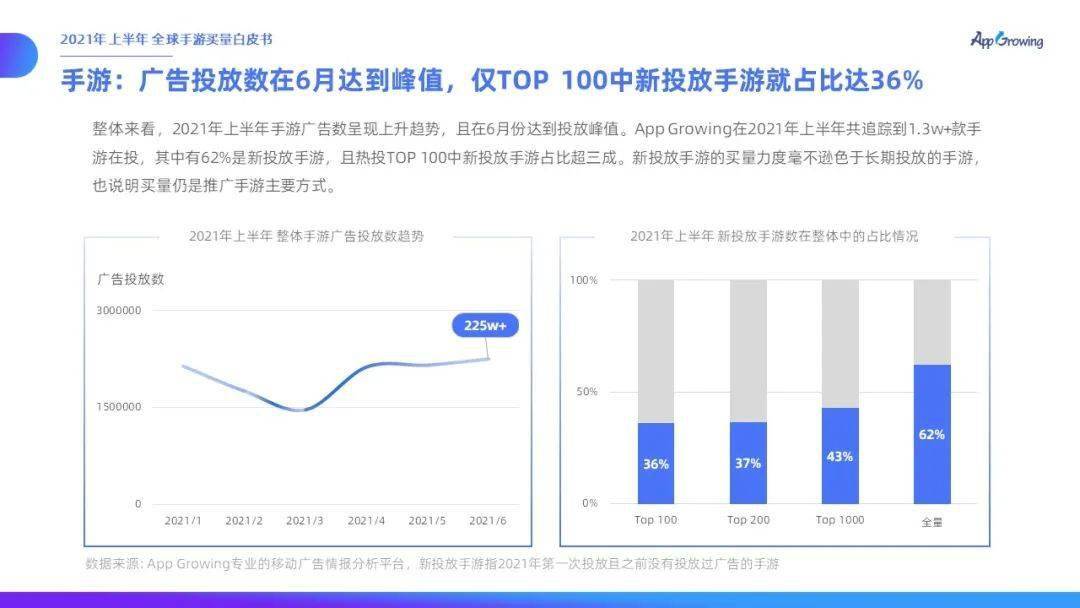 App Growing 在2021年上半年共追蹤到1.3w+款手游在投,其中有62%是新投放手游,且熱投TOP100中新投放手游占比超三成。新投放手游的買量力度毫不遜色于長(zhǎng)期投放的手游。