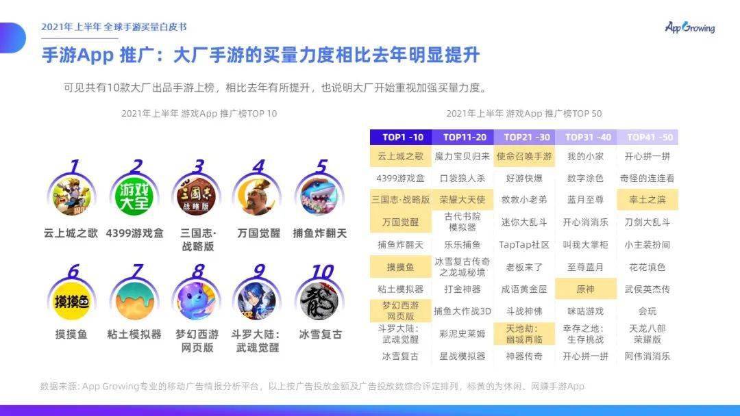 在手游App 推廣方面,可見2021年上半年整體熱投手游榜TOP 50中有10款大廠手游上榜。