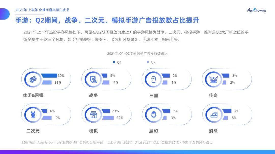 統(tǒng)計(jì)2021年上半年的重點(diǎn)手游風(fēng)格,可以發(fā)現(xiàn)休閑&網(wǎng)賺、戰(zhàn)爭(zhēng)、三國是今年上半年投放力度最強(qiáng)的三大重點(diǎn)手游風(fēng)格,而同比Q1時(shí),戰(zhàn)爭(zhēng)、二次元、模擬在Q2投放力度提升。
