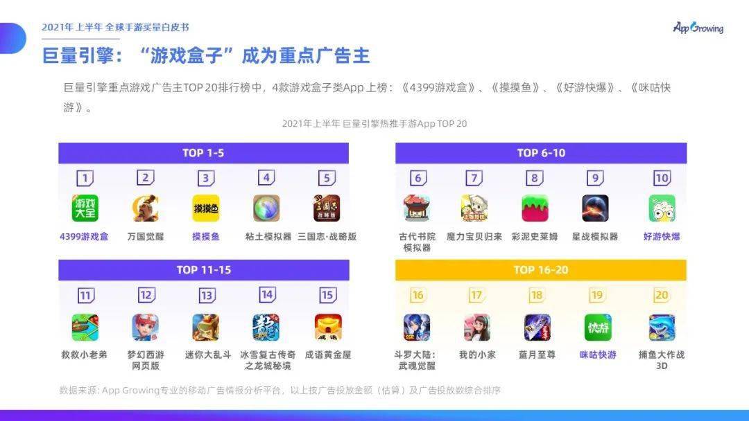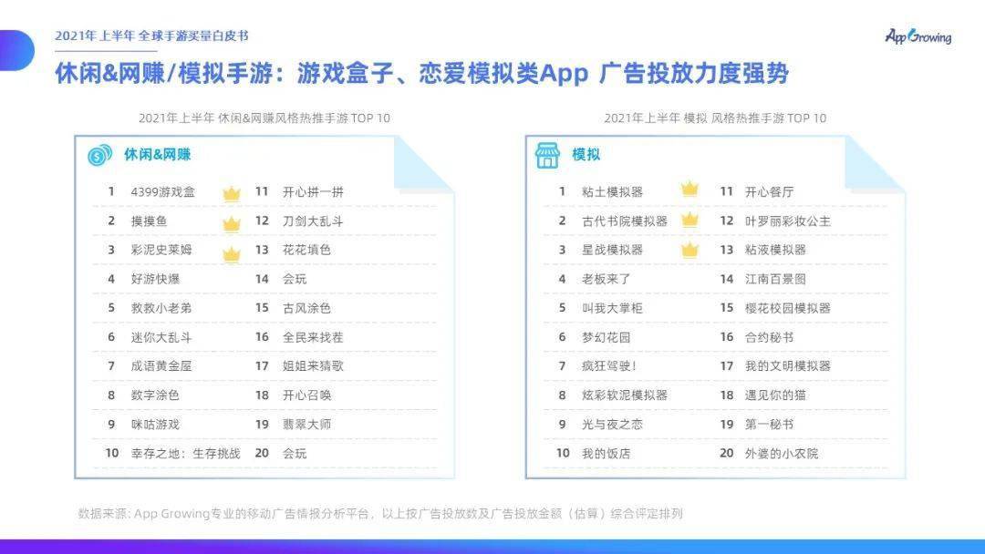 具體到每個(gè)重點(diǎn)風(fēng)格下的熱推手游,《4399游戲盒》成為 2021年上半年休閑&網(wǎng)賺手游熱推App TOP 1,也可以發(fā)現(xiàn)類似的“游戲盒子”平臺(tái)在今年上半年的廣告投放力度也比較大,比如《摸摸魚》、《好游快爆》、《咪咕游戲》。