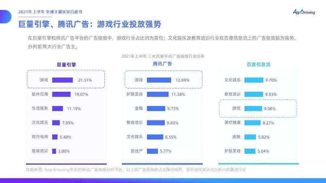 從三大平臺(tái)的行業(yè)投放分布情況來看,游戲行業(yè)是巨量引擎、騰訊廣告的重點(diǎn)廣告主,其中在巨量引擎中游戲行業(yè)廣告投放占比超20%。